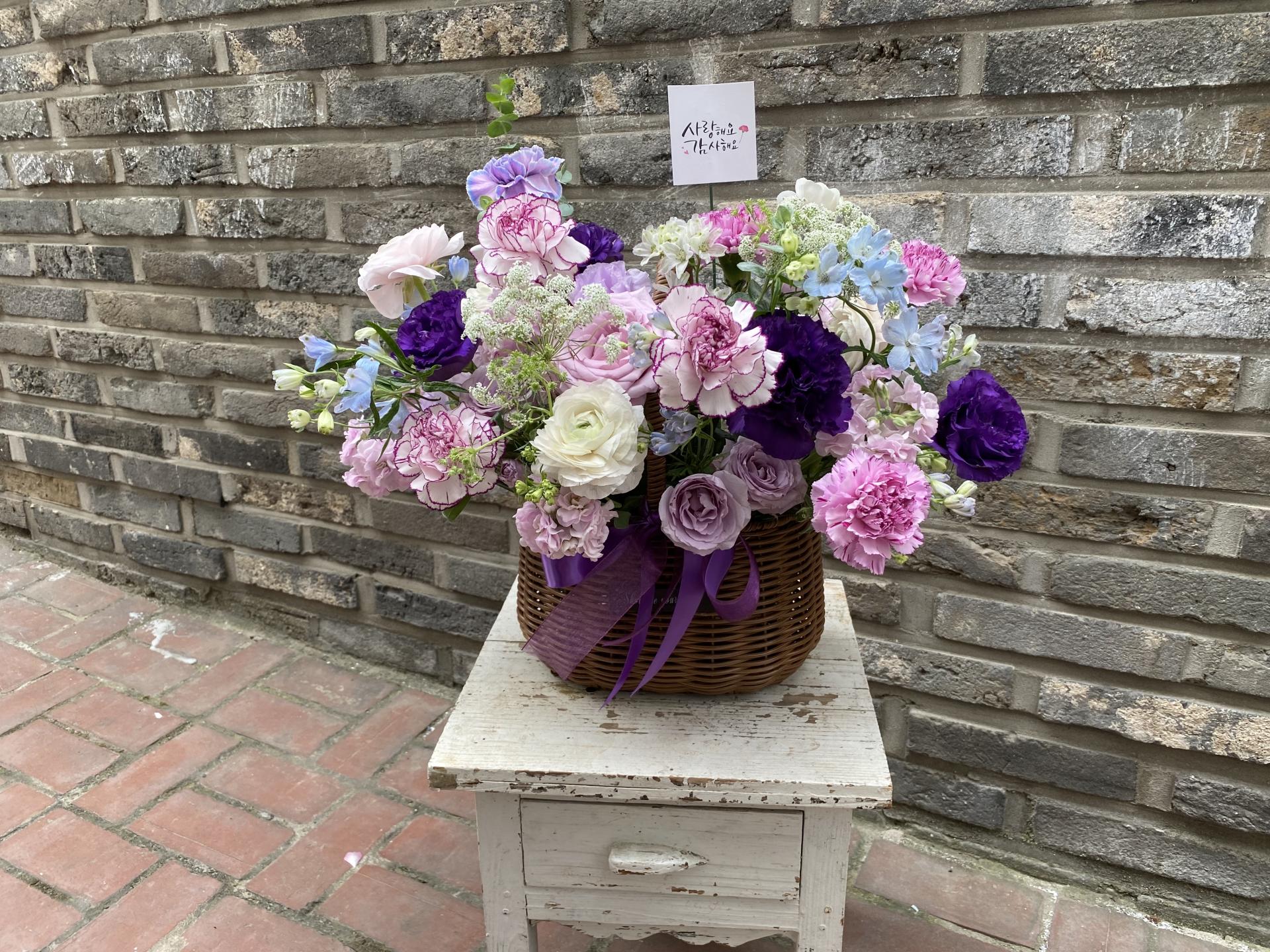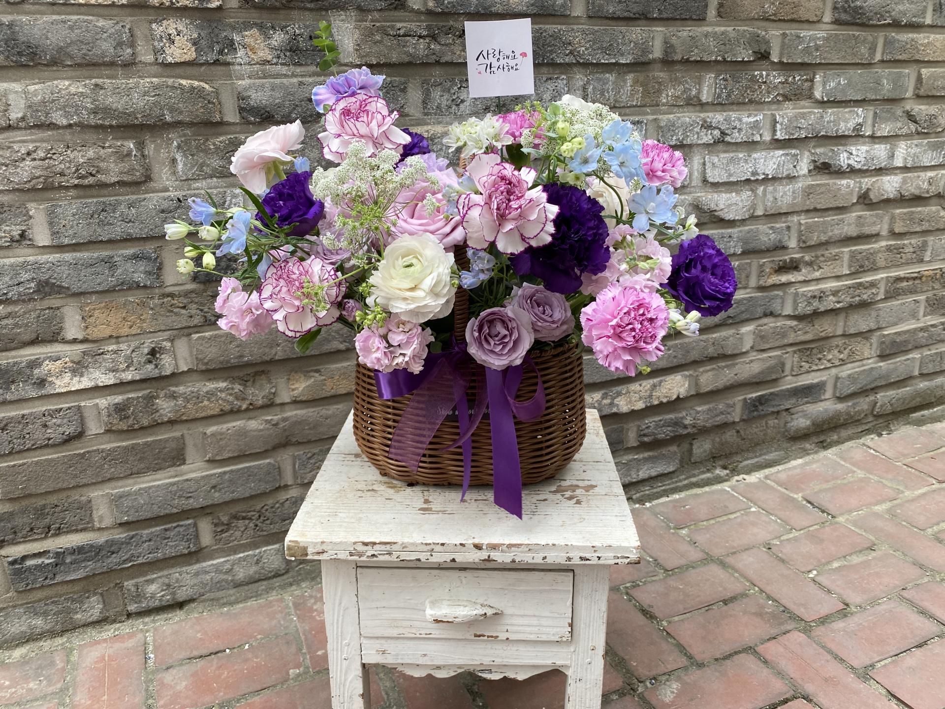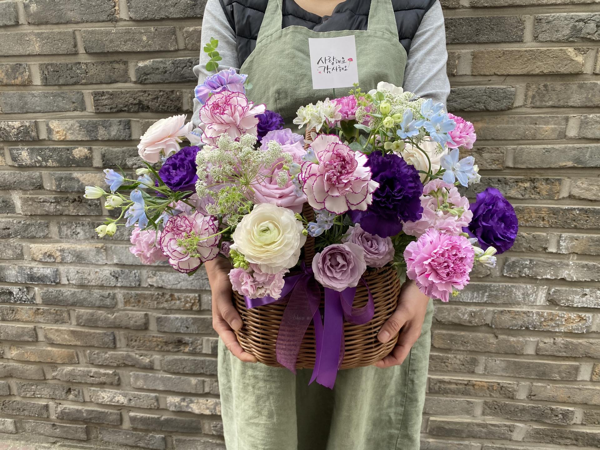 보라색을 섞은 고급스러운 느낌의 카네이션 꽃바구니